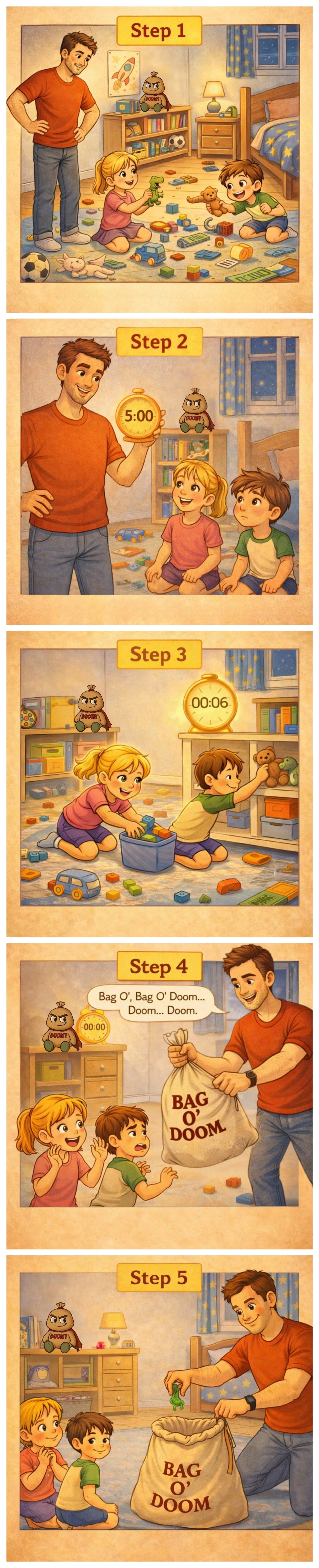 Bag O’ Doom turns everyday toy cleanup into a fast, predictable routine. Kids get a clear warning, a short window to act, and a playful consequence that keeps things moving without power struggles.