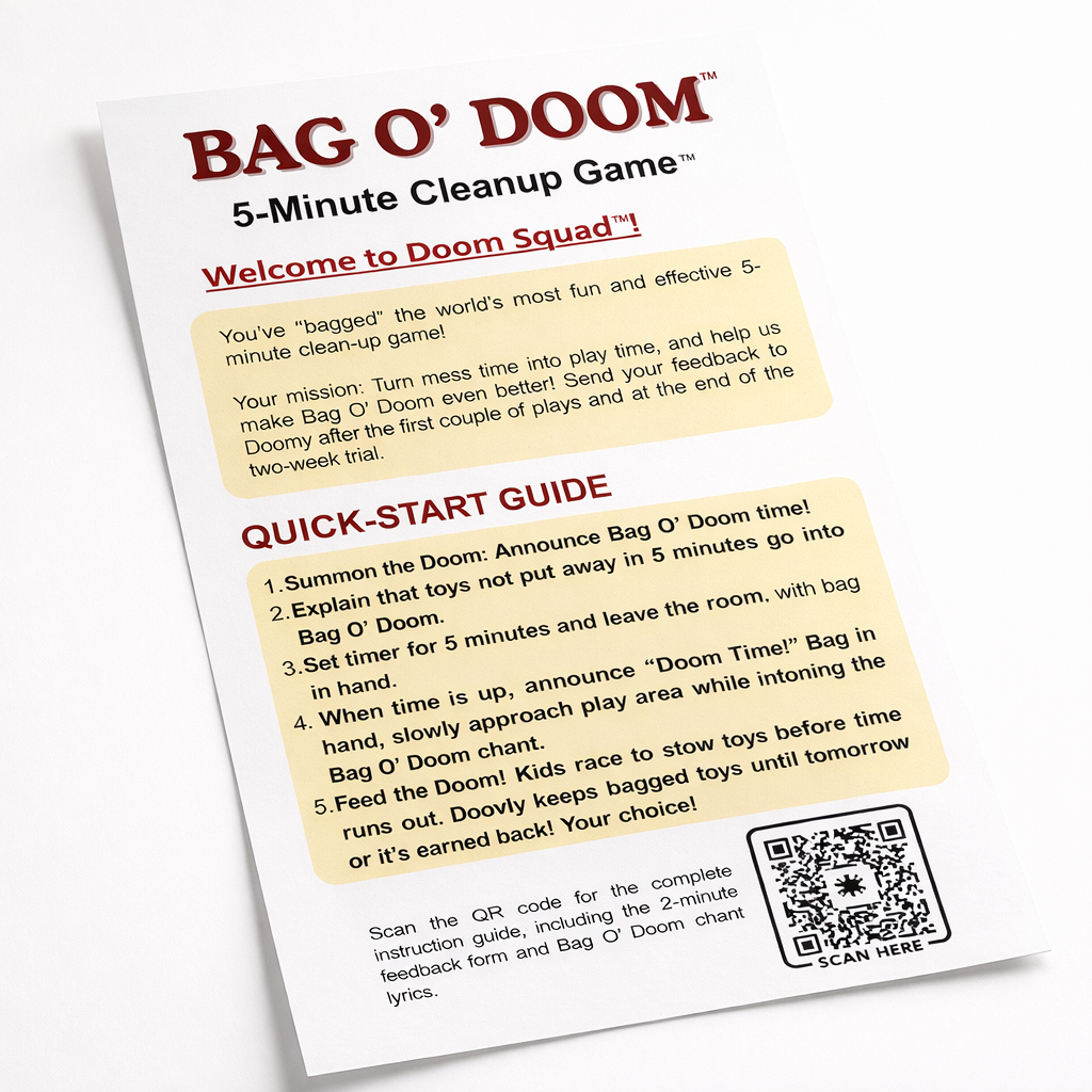 A simple, guide that explains the Bag O’ Doom routine and how to use it consistently. It outlines the basic rules, timing, and follow-through, while leaving flexibility for parents to decide what works best for their family.